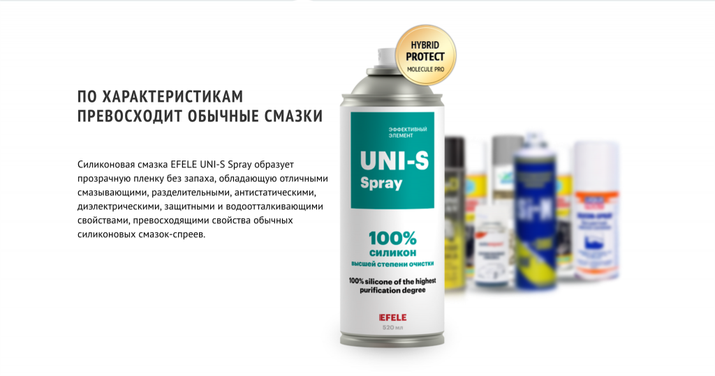 В составе гибридной силиконовой смазки EFELE UNI-S SPRAY не содержится керосина и других растворителей.